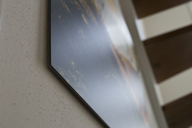 Nach dem Auspacken begutachtete ich zunächst das Bild um mich davon zu überzeugen, dass es absolut makellos ist. 3mm starkes Aluminium wirkt auf dem ersten Blick sehr anfällig. Das Wandbild ist aber komplett formstabil und astrein verarbeitet. Die Oberläche ist gerade und die Kanten sind sauber geschnitten.